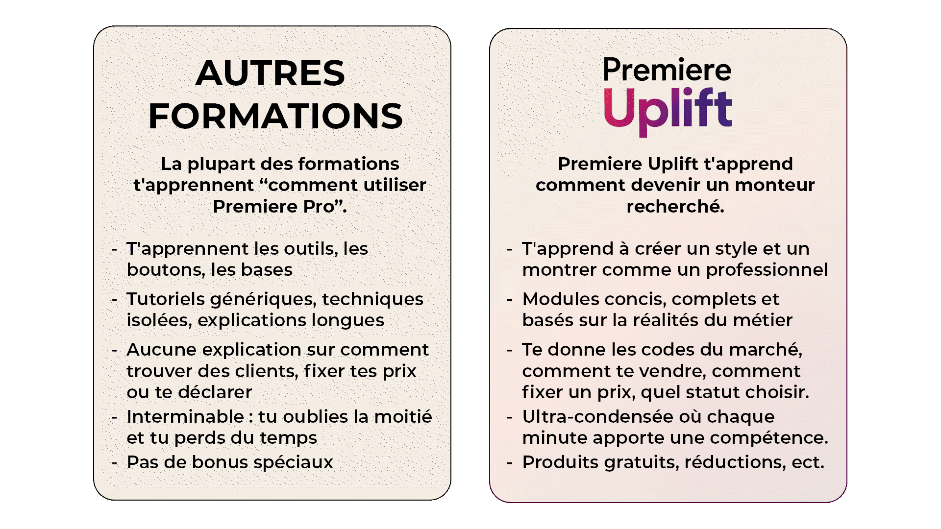 Premiere Uplift est une formation en ligne conçue spécifiquement pour les monteurs intermédiaires qui veulent franchir le cap vers l'excellence professionnelle.
